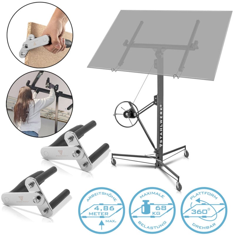 Dati tecnici Modello: Sollevatore per pannelli a secco STAHLWERK Dimensioni: 1420 x 1220 x 1330 mm Dimensioni (unità di base dello stativo): 1420 x 1220 x 200 mm Carico massimo: 68 kg Superficie di appoggio: 1250 / 2340 / 2950 x 900 + 160 (staffa di montaggio) mm Caratteristiche del piano d'appoggio: girevole a 360° in orizzontale / inclinabile a 65,5 Altezza minima di lavoro: 1,92 m Altezza massima di lavoro: 4,86 m Peso: 38 kg Modello: STAHLWERK Set di 2 supporti per piattaforma Campo di serraggio: 45 mm Materiale: acciaio inox / plastica / gomma Peso: 452 g Contenuto della fornitura 1 x sollevatore per pannelli in cartongesso STAHLWERK 2 x sollevatore di pannelli STAHLWERK