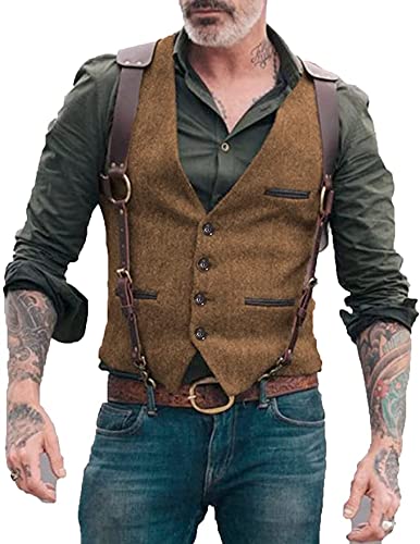 3.Gilet da Abito da Uomo Elegante Tweed Panciotto Scollo a V, 3 vere tasche e 4 bottoni.
