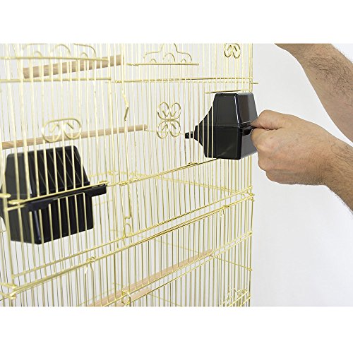 Le sbarre color oro unite alle forme eleganti della struttura donano alla gabbia un aspetto molto raffinato. Sulla parte frontale ci sono 2 ampie porte che misurano ben 31x29 cm, utilissime per allestire l'interno con facilità, altre quattro porte consentono l'inserimento delle 4 mangiatoie in dotazione.