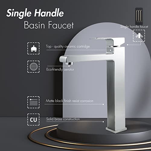 SOLVEX Rubinetto per Lavabo Alto,Rubinetto Monocomando per Lavabo Rettangolare,Ottone - Finitura Cromata Stile Moderno,Miscelatore Lavabo Bagno Quadrato con Aeratore,Fredda e Calda Regolabile,SP-12016