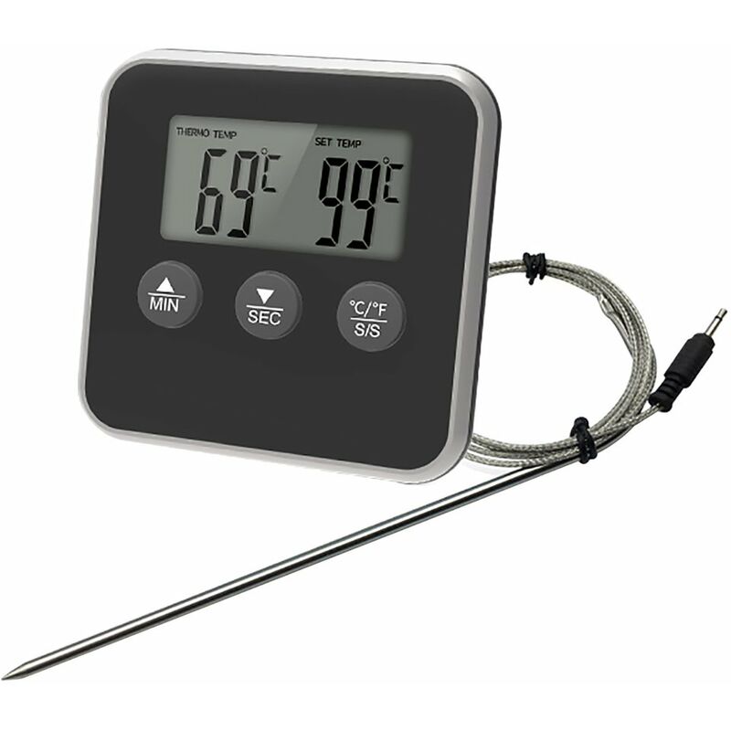 1. Intervallo di misurazione della temperatura: - 50 ℃~ 300 ℃ 2. Risoluzione della temperatura: 1℃ 3. Errore di temperatura: - 10°C-50°C ±1,5°C, 0°C-200°C ±1°C, 201°C-300°C ±1,5°C 4. Funzione timer: 99 minuti e 59 secondi 5. Modalità di impostazione manuale: puoi impostare liberamente una temperatura specifica in base ai tuoi gusti. 6. Unità di temperatura: Fahrenheit o Celsius possono essere convertiti. 7. Funzione timer: Quando viene raggiunta l'ora impostata, suonerà un allarme. 8. Funzione di allarme: Quando la temperatura attuale del cibo raggiunge la temperatura preimpostata, il cicalino emetterà un segnale acustico di gocciolamento. 9. Modalità di alimentazione: due batterie AAA n. 7 x1 (non incluse)