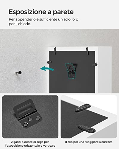 1 CORNICE, 4 MODI: Orizzontale, verticale, appeso o in piedi—con ganci dentati sul retro per un facile montaggio alla parete e una cornice larga 4 cm per restare stabilmente sul tavolo, questa cornice si adatta a qualsiasi disposizione tu stia pianificando