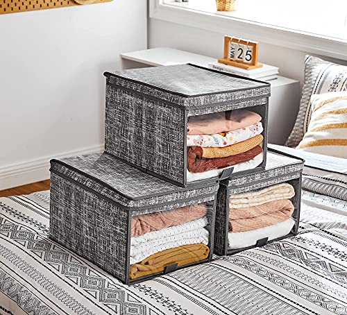 SONGMICS Scatole portaoggetti in tessuto, set di 3 cassapanche, contenitori con lato trasparente, coperchio, linguetta, motivo lino, grigio RFB103G01