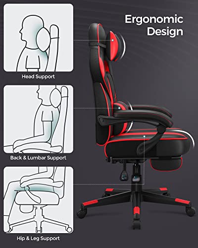 SONGMICS Sedia da Gaming, Sedia da Ufficio Ergonomica, con Schienale Alto, Poggiapiedi Telescopico, Schienale Regolabile, Poggiatesta e Supporto Lombare, Portata 150 kg, Nero e Rosso OBG73BRV1