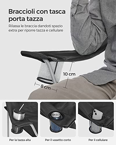 SONGMICS Sedie da Campeggio, Set di 2 Sedie da Esterno, Schienale Alto, con Braccioli, Tasca per Tazza, Pieghevole, Portante 150 kg, per Campeggio, Giardino, Pesca, Terrazza, Nero GCB08BK