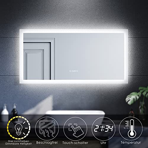 SONNI Specchio LED Bagno 120x60 cm con Tre Temperature di Colore,Specchio da Parete Grande Lungo con Antiappannamento Touch Control Doppio Interruttore,Visualizzazione Temperatura e Ora