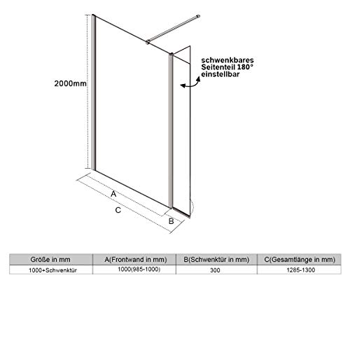 SONNI Walk in Box Doccia 100 x 200 cm, Dotato di un Pannello Laterale Ruotabile di 30 cm, Parete Doccia Fissa 8mm, Vetro Trasparente Temperato Rivestimento Nano, Regolabile con Stabilizzatore