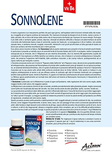Sonnolene è composto di estratti secchi titolati e standardizzati di Escolzia, Papavero rosso, Passiflora, Luppolo, Melissa, Biancospino, Valeriana, con inoltre Magnesio, Vitamina B6 e Melatonina.