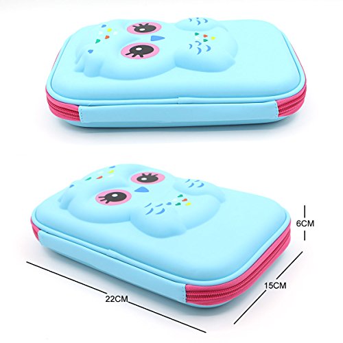 Soocute, astuccio rigido con gufo, portamatite elegante, in gomma EVA, con grande capacità, per studenti e bambini Light Blue