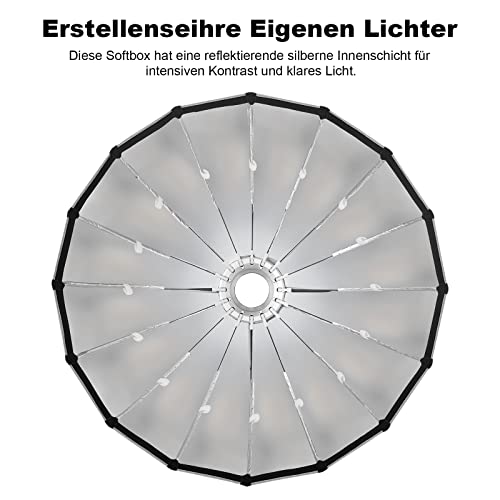 【Eccellente design del box parabolico profondo esadecagonale】SOONPHO SP-90/SP-120 Rispetto al softboz tradizionale, il design del telaio dell'ombrello, entrambe le 16 aste metalliche e il corpo sono collegate insieme, con l'anello di velocità di rilascio rapido, è possibile aprire o chiudere il softbox in pochi secondi.Funziona come un riflettore sovradimensionato, ottimo per la concentrazione della luce e per ottenere effetti di illuminazione morbidi e altamente saturi.