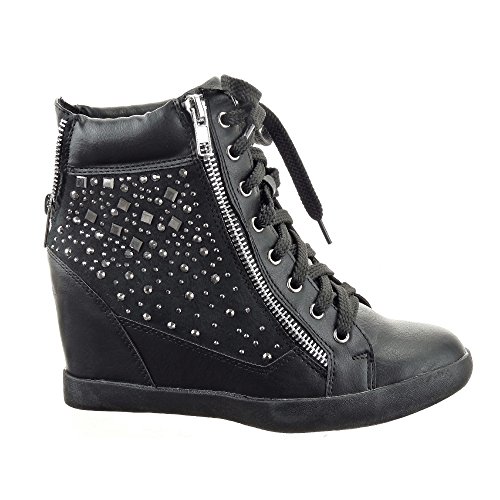 Sopily - Scarpe da Moda Sneaker Zeppa Alti Donna Strass Zip Tacco Zeppa 9 CM - Soletta Pelle - Nero