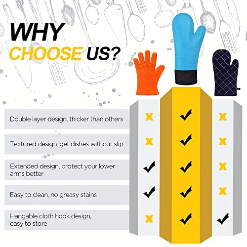 Guanti forno resistenti al calore: I nostri guanto forno in gomma sono realizzati al in silicone alimentare di alta qualità e con un rivestimento interno in cotone trapuntato traspirante. Hanno una resistenza termica fino a 230°C / 446°F. La resistenza al calore è superiore alla stoffa quando si tratta di gestire vapore o forno, proteggendo i polsi e la parte inferiore del braccio durante l'estrazione degli oggetti dal forno.