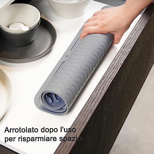 ⭐【Richiudibile per risparmiare spazio】Il tappetino lavello cucina è realizzato in morbido silicone e può essere arrotolato e riposto dopo aver scolato le stoviglie, in modo da poter essere riutilizzato la volta successiva senza lasciare grinze o deformazioni.