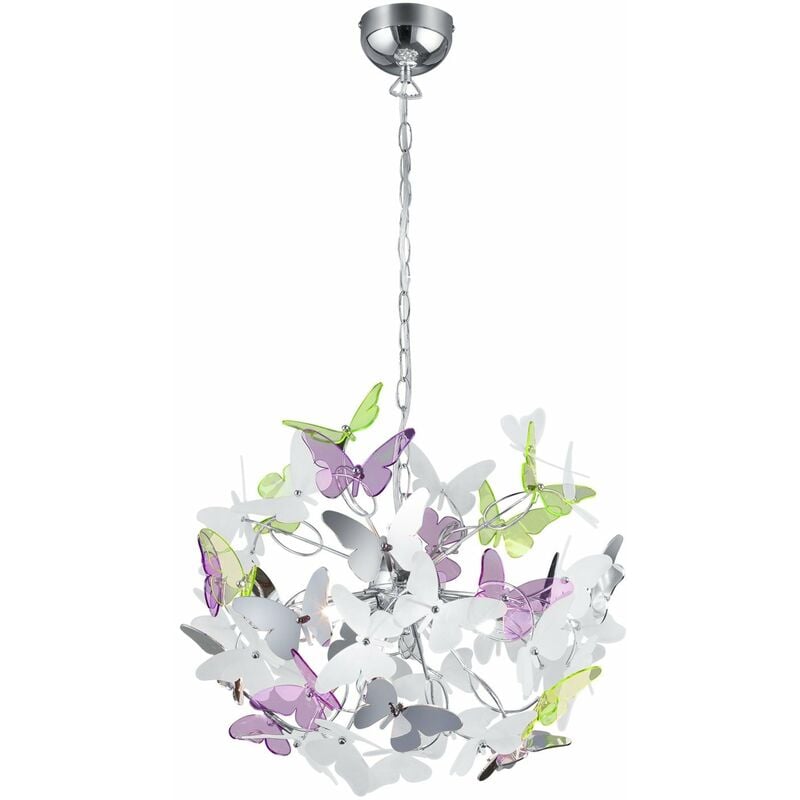 Lampadario butterfly in cromo a 4 luci, con lampadina esclusiva, sono consigliate 4 lampadine max. 28.watt. La lampada è un set farfalle in bianco ghiaccio in acrilico e ciascuno 6.x farfalle in acrilico di colore verde/viola/cromo per personalizzare la lampada individuale.