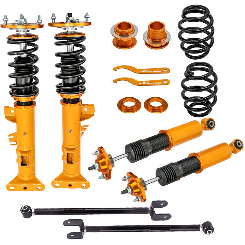 sedan and convertible 1992-1999 Specification Quantity: One Set Coilover (2 Front+2 Rear) One Pair Rear Camber Control Arm Spring rate Front: 8 kg/mm (448 lbs/in) Spring rate Rear: 8 kg/mm (448 lbs/in) Adjustable damper: non-adjustable damper force Adjustable height: Yes Adjustable camber plate: Yes Warranty: 2 years warranty for any manufacturing defect Feature * Adjustable ride height * Adjustable pre-load spring tension * Pillow ball top mount -- this design helps combat noise while tuning. It also improves the steering feel and response * Most components are made from