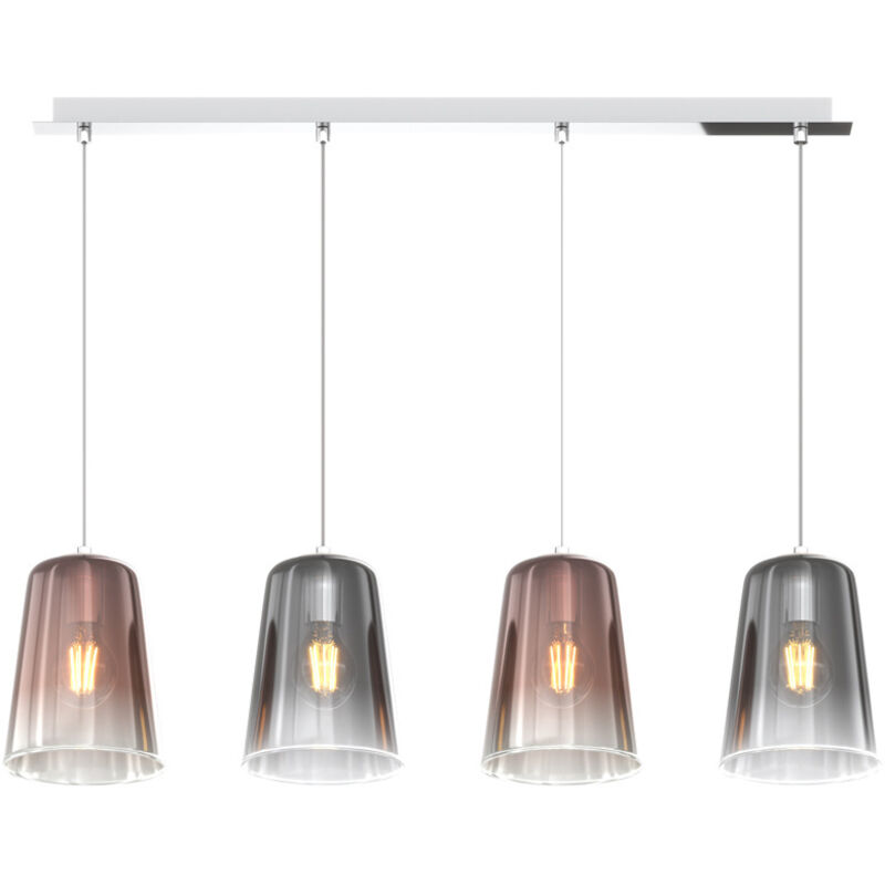 Collezione Shaded IL CONNUBIO PERFETTO TRA ARTE E LUCE Sospensione 4 luci con rosone rettangolare e con 4 coni in vetro pirex soffiato colore rame e cromo.. Le finiture dei vetri cromo, rame e ambra sono trattamenti superficiali sfumati verso il basso. Le strutture in metallo sono disponibili nelle finiture cromo, bianco e ottone satinato. La serie viene completata da una lampada da appoggioQuesto articolo è disponibile in diverse finiture e/o dimensioni. E' possibile indicarlo nell'apposito campo NOTE presente in conclusione di ordine oppure contattarci dopo aver effettuatol'ordine.