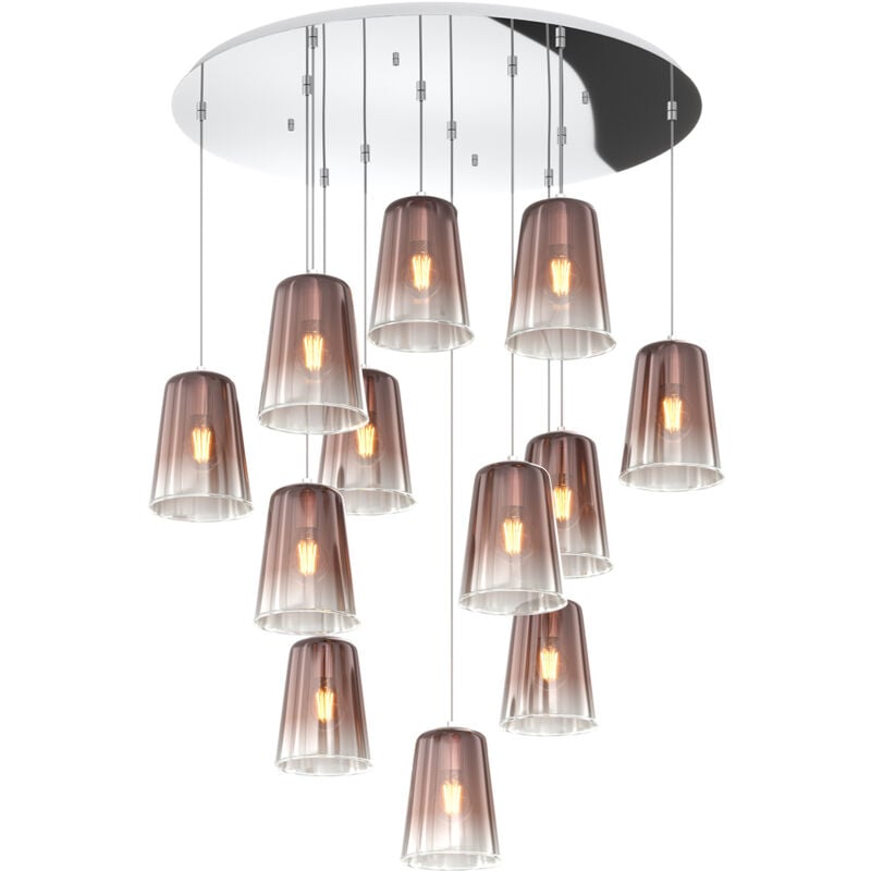 Collezione Shaded IL CONNUBIO PERFETTO TRA ARTE E LUCE Sospensione 12 luci con struttura in metallo cromo e rosone tondo e con 12 coni in vetro pirex soffiato colore rame posti in altezza differente tra di loro.. Le finiture dei vetri cromo, rame e ambra sono trattamenti superficiali sfumati verso il basso. Le strutture in metallo sono disponibili nelle finiture cromo, bianco e ottone satinato. La serie viene completata da una lampada da appoggioQuesto articolo è disponibile in diverse finiture e/o dimensioni. E' possibile indicarlo nell'apposito campo NOTE presente in conclusione di ordine oppure contattarci dopo aver effettuatol'ordine.