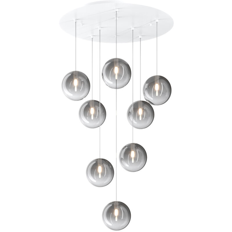 Collezione Eclipse IL BENVENUTO ALLA LUCE Sospensione 8 luci regolabile in altezza, composta da una struttura metallo bianco, un rosone tondo e sfere di vetro pirex finitura fumè.. La finitura dei vetri si presenta omogenea nelle versioni trasparente e bianco fog oppure sfumata verso il basso nelle versione ambra, rame, oro e fumè. Le strutture in metallo sono disponibili nelle finiture cromo, bianco e ottone satinato.Questo articolo è disponibile in diverse finiture e/o dimensioni. E' possibile indicarlo nell'apposito campo NOTE presente in conclusione di ordine oppure contattarci dopo aver effettuatol'ordine.