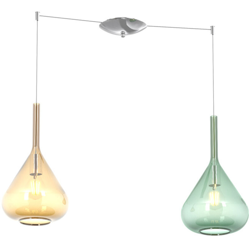 Collezione Kona LAMPADA MODERNA CHE CATTURA LO SGUARDO Sospensione 2 luci con struttura in metallo color cromo, un rosone tondo con decentratori e 2 vetri pirex soffiato colore multicolor come diffusore.. Le finiture dei vetri disponibili sono trasparente, verde, blu, fumè ed ambra. Le strutture in metallo sono disponibili nelle finiture cromo, bianco e ottone satinato. Nella confezione sarà compreso il portalampada nelle finiture cromo, otttone satinato e bianco, dove il cliente al momento dell' installazione sarà libero di scegliere il colore desiderato.Questo articolo è disponibile in diverse finiture e/o dimensioni. E' possibile indicarlo nell'apposito campo NOTE presente in conclusione di ordine oppure contattarci dopo aver effettuatol'ordine.