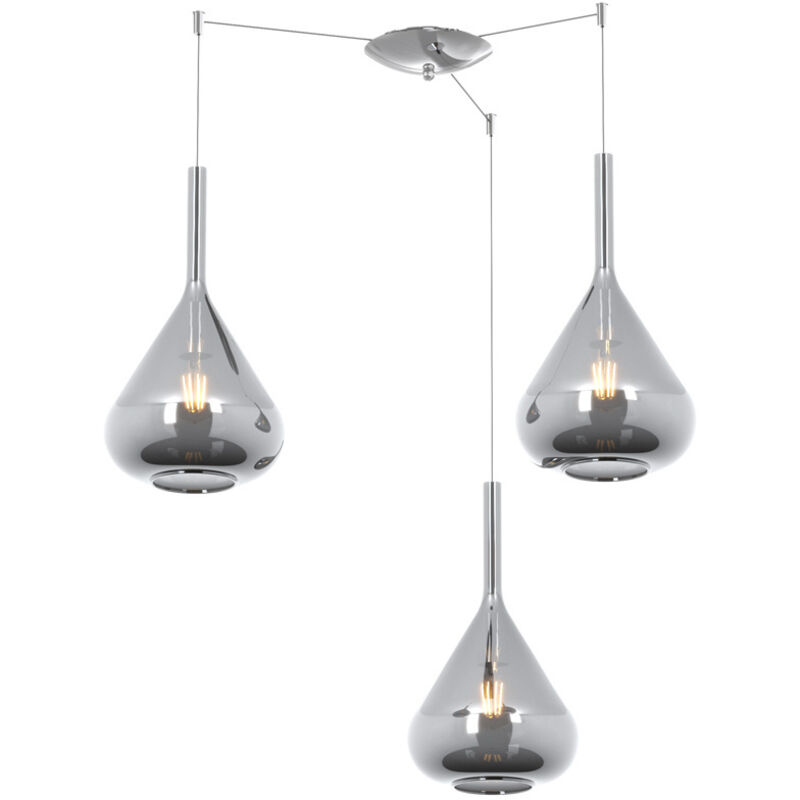 Collezione Kona LAMPADA MODERNA CHE CATTURA LO SGUARDO Sospensione 3 luci con struttura in metallo color cromo, un rosone tondo con decentratori e 3 vetri pirex soffiato colore fumè come diffusore.. Le finiture dei vetri disponibili sono trasparente, verde, blu, fumè ed ambra. Le strutture in metallo sono disponibili nelle finiture cromo, bianco e ottone satinato. Nella confezione sarà compreso il portalampada nelle finiture cromo, otttone satinato e bianco, dove il cliente al momento dell' installazione sarà libero di scegliere il colore desiderato.Questo articolo è disponibile in diverse finiture e/o dimensioni. E' possibile indicarlo nell'apposito campo NOTE presente in conclusione di ordine oppure contattarci dopo aver effettuatol'ordine.