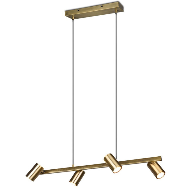La lampada a sospensione MARLEY di Trio Lighting è composta da struttura in metallo di colore ottone invecchiato con rosone rettangolare, cavetti regolabili e 4 faretti spot cilindrici orientabili. Grazie ai cavetti regolabili in lunghezza è possibile variare l'altezza del lampadario in base le proprie esigenze. E' possibile installare 4 lampadine con attacco GU10 max 35 watt, acquistabili separatamente. I piccoli spot possono essere orientati in modo da indirizzare il flusso luminoso in specifici punti di interesse. Un elemento pratico e versatile, con il suo design moderno si adatta bene a tutti gli ambienti, perfetto per essere installato ad esempio nella zona living, all'ingresso o nello studio. Disponibili le varianti di colore e misura e altri articoli della stessa serie.