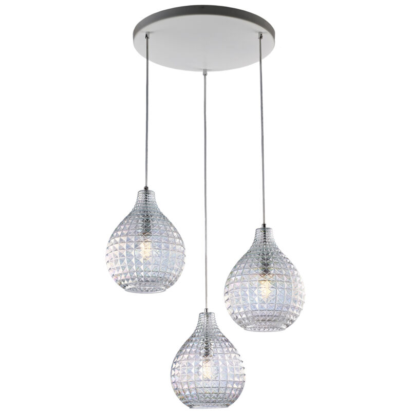 Sospensione in ferro laccato bianco e montatura cromo con cavi elettrici regolabili e diffusori in vetro soffiato trasparente con decoro effetto cristallo 3 luci