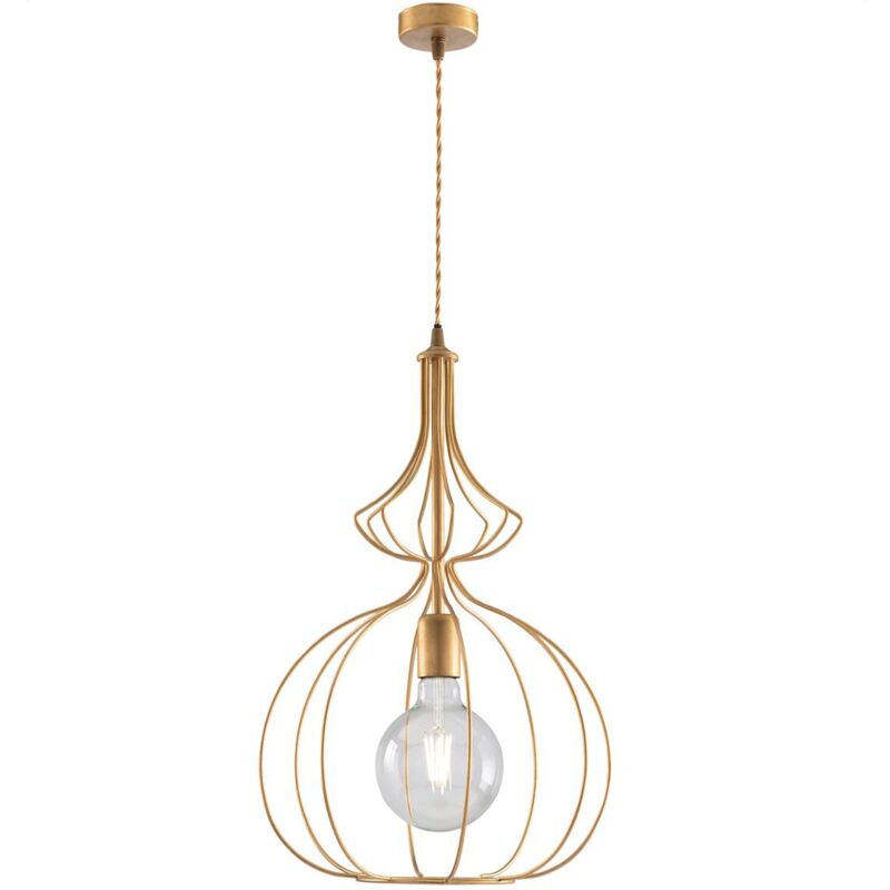 Collezione Olimpia FILI DI METALLO FORGIATI A MANO Sospensione stile industrial 1 luce. La sagoma tipo gabbia è in ferro laccato oro antico. . Corredata da cavetto trasparente con filo in acciaio per regolarne l'altezza. Una sospensione semplice intrisa di un fascino senza tempo. Punto luce ideale per la tavola della sala da pranzo industriale o per la sala di un ristorante dal design minimal. Disponibile in altre varianti.