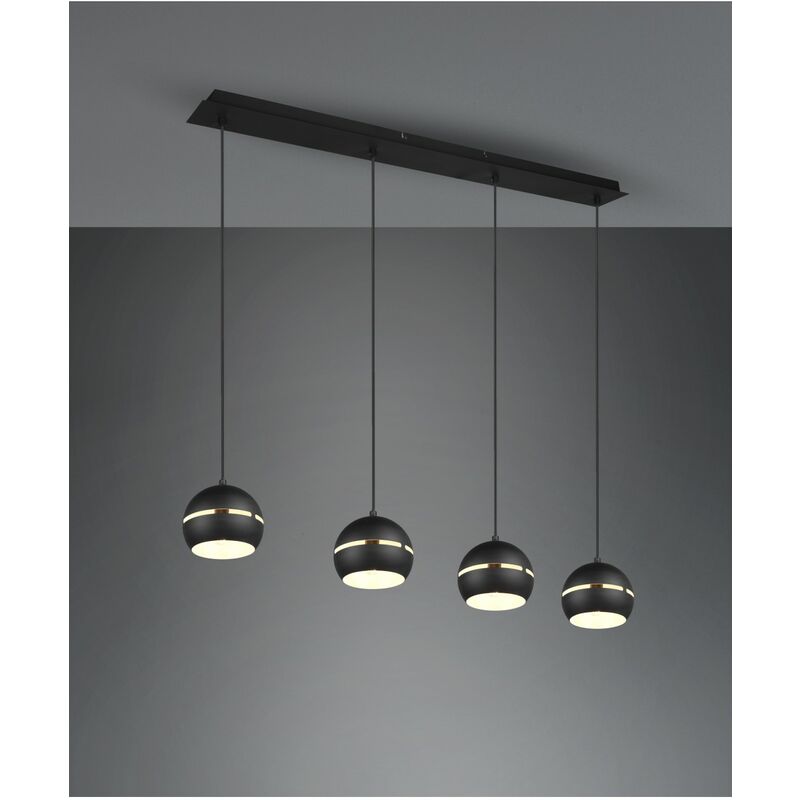 Sospensione Lineare con 4 Diffusori Sferici Nero La sospensione FLETCHER di Trio Lighting è composta da una montatura lineare in metallo finitura nero opaco con cavetti pendenti e 4 diffusori sferici in tinta con la struttura. I cavi regolabili in lunghezza consentono di variare l'altezza di ogni punto luce in base alle vostre esigenze e i vostri gusti. È possibile installare 4 lampadine con attacco E14 da max 40 watt, acquistabili separatamente. Per avere una migliore efficienza luminosa e al contempo un basso consumo energetico è consigliabile l'utilizzo di lampadine a filamento Led. Un lampadario lineare, dal design elegante e moderno, consigliata per illuminare in maniera diretta ed ampiamente diffusa verso il basso. Ideale ad esempio da installare in ambienti residenziali come sopra il tavolo di una cucina o di una zona living o ancora in contesti lavorativi come sopra scrivanie di studi e uffici. Disponibile anche nei colori ottone e nichel.