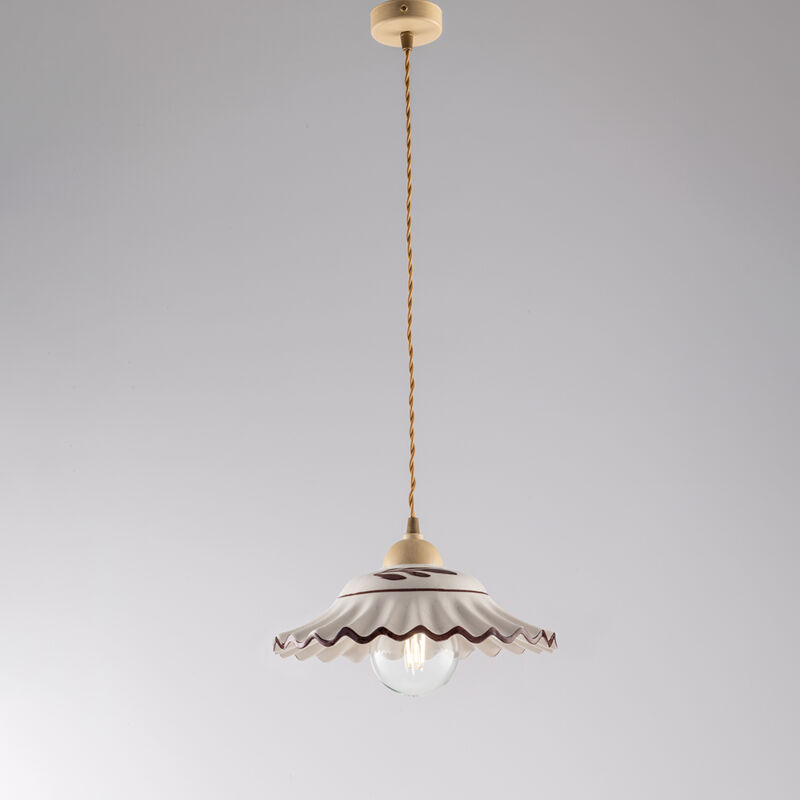 Collezione Palma CERAMICA DECORATA PER AMBIENTI RUSTICI Sospensione 1 luce con diffusore in ceramica plissettata color bianco lucido con filo marrone diametro.30 cm. La ceramica è l'elemento principale di questa serie impreziosita dai minuziosi decori eseguiti manualmente che riproducono delle palme marroni. Completata da parti metalliche laccate color avorio con un cavo in tessuto. Punto luce ideale per ricreare un clima accogliente e familiare nella vostra casa rustica in montagna.
