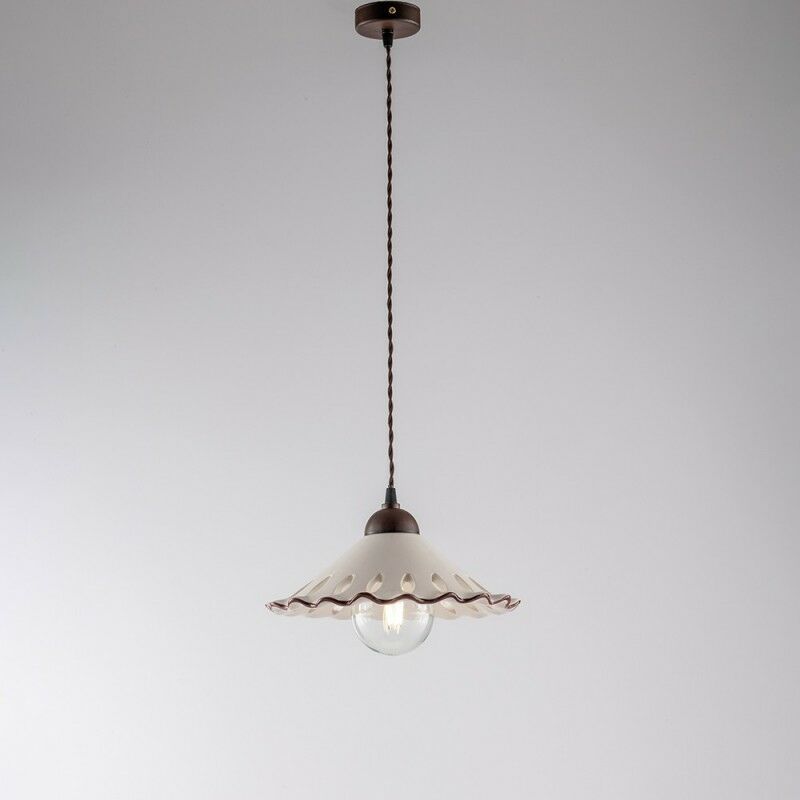 Lampadario con cavo in tessuto Nero Ruggine una luce paralume in ceramica Bianco 30x h15 cm Specifiche Lampadario con cavo in tessuto Colore Nero con rifinitura Ruggine Paralume in ceramica Bianco Lucido decorata Luci 1x E27 MAX 60W Attacco Grande LED, Risparmio energetico o Alogene Lampade non incluse Prodotto artigianale MADE IN ITALY Dimensioni Diametro 30 cm Altezza 15 cm Altezza massima 90 cm.