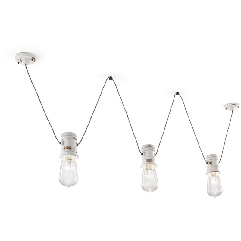 Collezione Retrò Urban L'INNOVAZIONE DAL SAPORE NOSTALGICO Sospensione 3 Luci diam.10,5 cm in ceramica con finitura vintage bianco lavorata a mano da artigiani specializzati. Questa sospensione grazie ai 3 punti luce illumina ambienti anche di grandi dimensioni con la sua luce non filtrata. La fusione tra i dettagli in metallo anticato, i componenti in ceramica vintage bianco ed il filo in tessuto intrecciato è palesemente ispirata alle vecchie fabbriche di una volta, icone che hanno ispirato lo stile Industrial. E' adatta ad un ambiente tipicamente Vintage. Questo articolo è realizzato interamente a mano ed è disponibile anche in altre finiture, come da foto campione. Per richiedere una composizione diversa è possibile indicarlo nell'apposito campo NOTE presente in conclusione di ordine indicando il codice della finitura oppure contattarci dopo aver effettuato l'ordine. Essendo un prodotto 100% artigianale, stai acquistando un prodotto unico e per tanto può differire leggermente