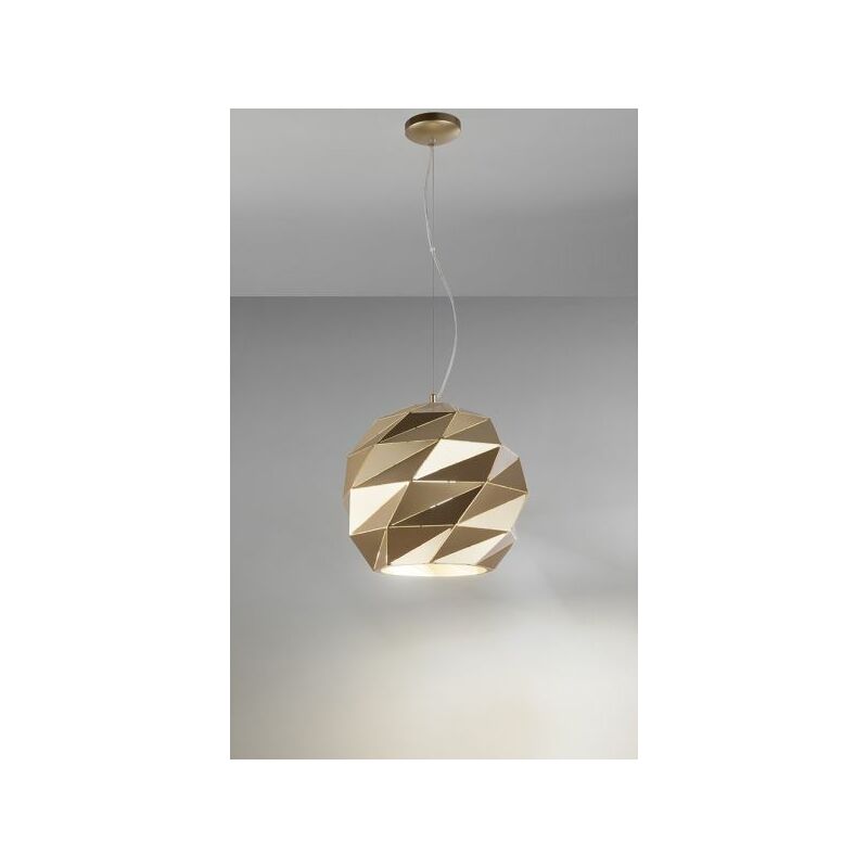 Sospensione con montatura in metallo verniciato a polveri. Paralume piegato e lavorato con taglio laser per permettere l'illuminazione anche dalla parte superiore.