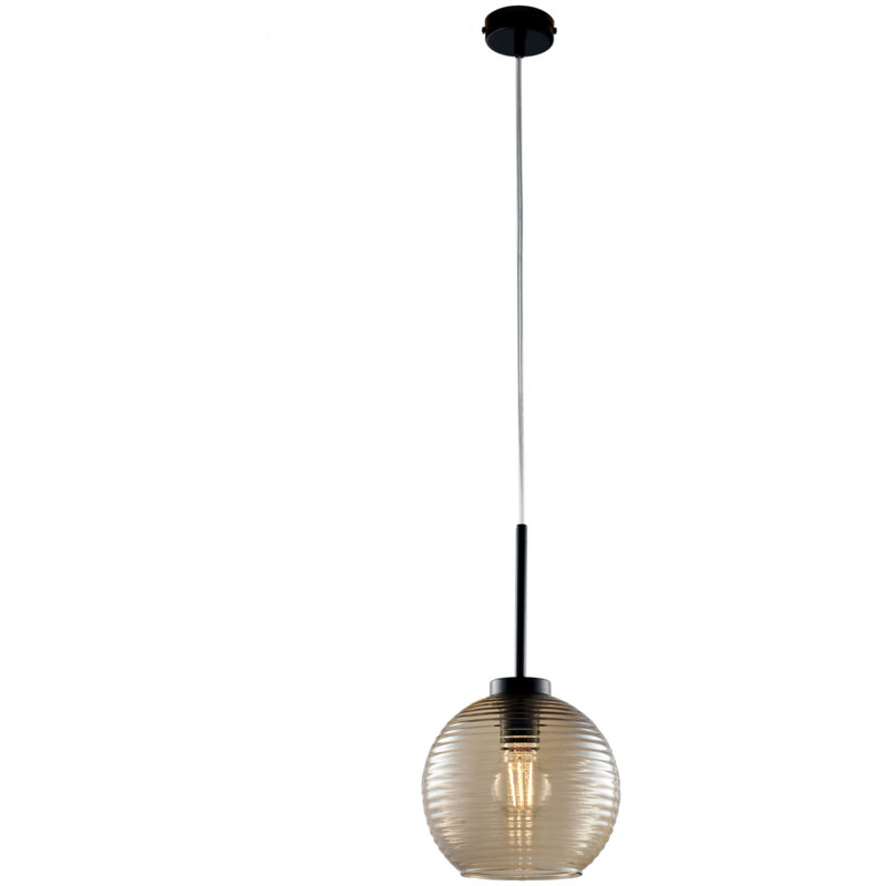 Collezione Ankara RAFFINATEZZA E TEXTURE PER IL TUO LIVING Sospensione ad una luce in ferro laccato nero con cavo elettrico regolabile. Diffusore in vetro soffiato ambra con rigatura in rilievo.. Perfetta per illuminare aree focali come tavoli da pranzo, isole da cucina o angoli salotto. Il design elegante e versatile si adatta a una varietà di stili di arredamento, dal contemporaneo al moderno, aggiungendo un tocco di eleganza ovunque sia collocata.