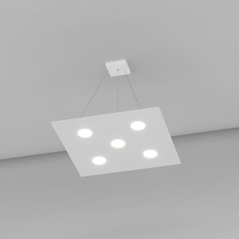 Collezione Area IL FASCINO MINIMALISTA DELL'ILLUMINAZIONE SENZA LAMPADINE Sospensione 5 luci realizzata con lastre quadrate in metallo verniciato in finitura bianca di forma quadrata.. Il punto di forza del prodotto consiste nel non utilizzare dei led integrati ma una lampadina Gx53 che, una volta montata, arriva a filo della lastra metallica e può essere facilmente sostituita dall'esterno. Questo articolo è disponibile in diverse finiture e/o dimensioni. E' possibile indicarlo nell'apposito campo NOTE presente in conclusione di ordine oppure contattarci dopo aver effettuatol'ordine.