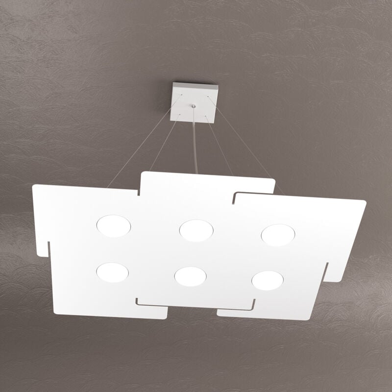 Collezione Echo LAMPADE CHE SI FONDONO CON LO SPAZIO Sospensione 6 luci realizzata con lastre quadrate in metallo verniciato bianco in diverse forme.. Queste lampade hanno un design essenziale e pulito, che si integra perfettamente con lo spazio e la luce. La lastra metallica è a filo con la lampadina Gx53, che puoi sostituire facilmente dall'esterno. La serie è disponibile in diverse dimensioni e forme, per adattarsi a ogni ambiente e a ogni gusto. Scopri la Serie Echo e lasciati impressionare dalla sua semplicità e qualità.Questo articolo è disponibile in diverse finiture e/o dimensioni. E' possibile indicarlo nell'apposito campo NOTE presente in conclusione di ordine oppure contattarci dopo aver effettuatol'ordine.