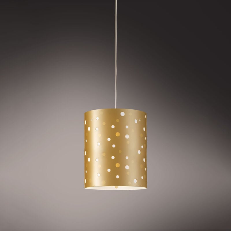 Collezione Pois ESSENZIALI E STRAVAGANTI Sospensione a 1 luce in polilux oro con rosone in plastica e cavo bianco. Il lampadario, disponibile in tanti colori, perfetto per illuminare ambienti moderni, b&b, asili, ludoteche, camerette, si integra perfettamente con qualsiasi arredamento, contemporaneo valorizzandone l'insieme, per un risultato davvero brioso e vivace. Cavo ad altezza regolabile. Il bicolor diventa divertente e pop nelle lampade della collezione Pois, essenziali nella sagoma ma stravaganti nell'estetica.