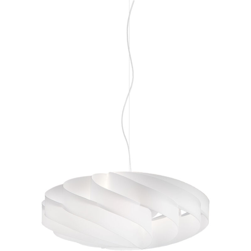 Collezione Flat DELICATA E DISTINTA Sospensione moderna a 3 luci realizzata in polilux bianco, dotata di cavo trasparente di 120 cm e rosone in metallo cromato. Linea moderna e leggera, grazie al design minimal della spirale che con l' avvolgersi dei fogli in polilux crea infiniti giri intorno ad un punto, dona all'ambiente armonia ed eleganza. Ben si presta ad illuminare ed arredare il living abitativo o l' ambito commerciale dallo stile moderno e contemporaneo. Disponibile in diverse finiture e molteplici misure. Sorella della collezione Globe, la lampada Flat incarna un ideale matematico di bellezza. Un solido scomposto ma regolare, delicato e distinto.