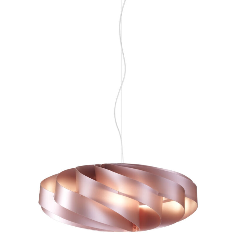 Collezione Flat DELICATA E DISTINTA Sospensione moderna a 3 luci realizzata in polilux rosa metallico, dotata di cavo trasparente di 120 cm e rosone in metallo cromato. Linea moderna e leggera, grazie al design minimal della spirale che con l' avvolgersi dei fogli in polilux crea infiniti giri intorno ad un punto, dona all'ambiente armonia ed eleganza. Ben si presta ad illuminare ed arredare il living abitativo o l' ambito commerciale dallo stile moderno e contemporaneo. Disponibile in diverse finiture e molteplici misure. Sorella della collezione Globe, la lampada Flat incarna un ideale matematico di bellezza. Un solido scomposto ma regolare, delicato e distinto.