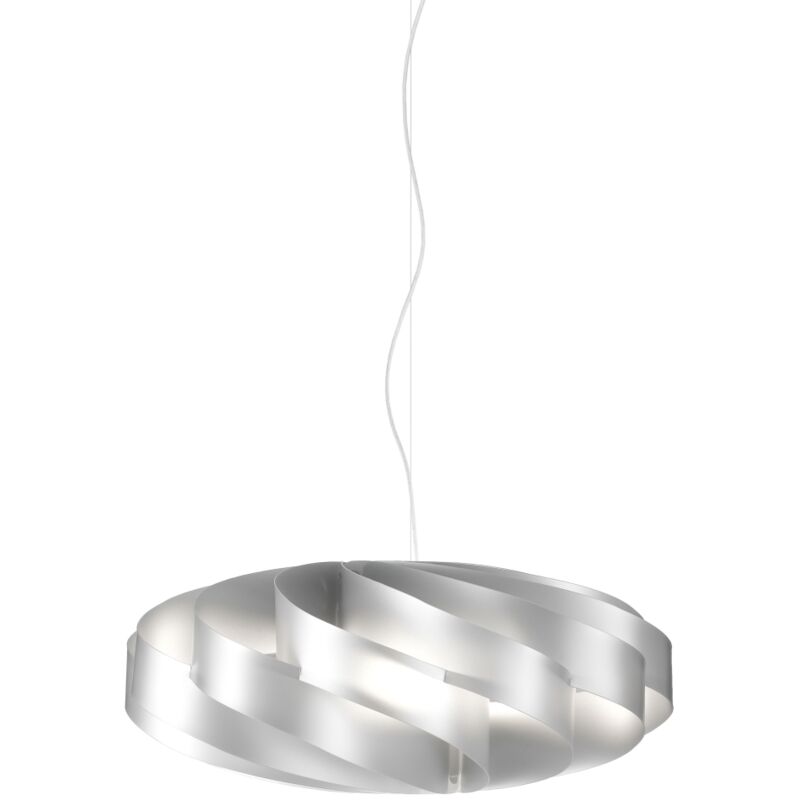 Collezione Flat DELICATA E DISTINTA Sospensione moderna a 3 luci realizzata in polilux silver, dotata di cavo trasparente di 120 cm e rosone in metallo cromato. Linea moderna e leggera, grazie al design minimal della spirale che con l' avvolgersi dei fogli in polilux crea infiniti giri intorno ad un punto, dona all'ambiente armonia ed eleganza. Ben si presta ad illuminare ed arredare il living abitativo o l' ambito commerciale dallo stile moderno e contemporaneo. Disponibile in diverse finiture e molteplici misure. Sorella della collezione Globe, la lampada Flat incarna un ideale matematico di bellezza. Un solido scomposto ma regolare, delicato e distinto.