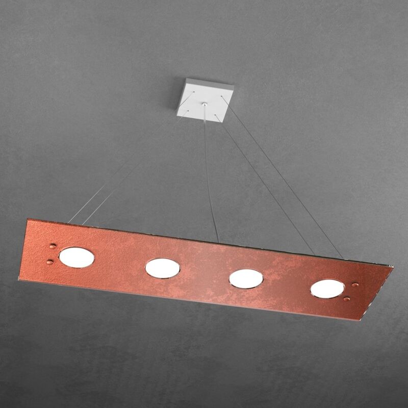 Collezione Path IL CAMMINO VERSO L'ILLUMINAZIONE SI FA BRILLANTE Plafoniera realizzata con lastre quadrate di vetro extrachiaro in finitura foglia rame, il cui lato a vista è trasparente con colorazione retrostante.. Il punto di forza del prodotto consiste nel non utilizzare dei led integrati ma una lampadina Gx53 che, una volta montata, arriva a filo della lastra di vetro e può essere facilmente sostituita dall'esterno. Disponibile anche nella finitura tortora scuro. Disponibile anche nella versione sospensione 4 luci più 2 e sospensione 4 luci più 3 in tutte le finiture disponibiliQuesto articolo è disponibile in diverse finiture e/o dimensioni. E' possibile indicarlo nell'apposito campo NOTE presente in conclusione di ordine oppure contattarci dopo aver effettuatol'ordine.