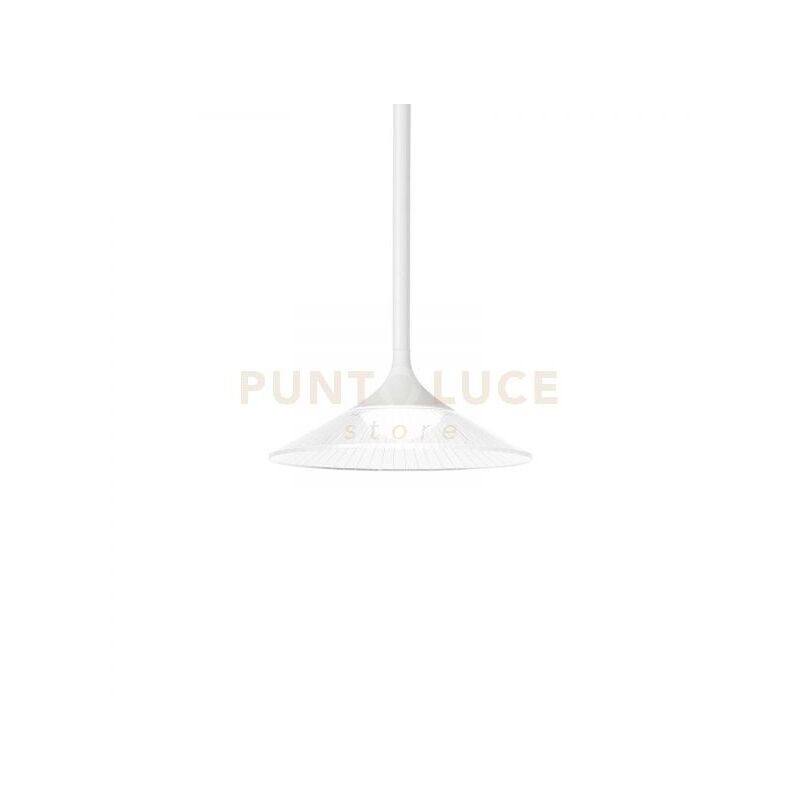 Lampada a sospensione con rosone e corpo luce in metallo verniciato a polveri. Paralume in acrilico trasparente rigato. Diffusore in policarbonato satinato. Cavo in pvc trasparente.