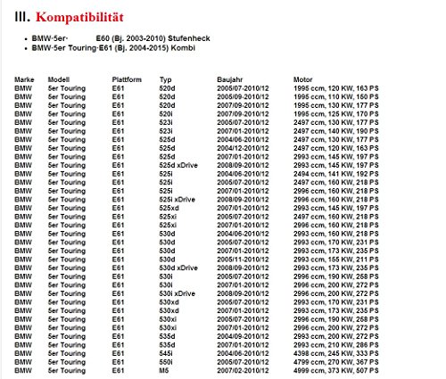 Adatto per i seguenti veicoli: Carro 5-Series Touring (E61) modelli includono: 520d, 520i, 523i, 525i, 525d, 530d, 525 x D, 525 x i, 530i, 530 x D, 530 x i, 535d, 545i, 550i, M5
