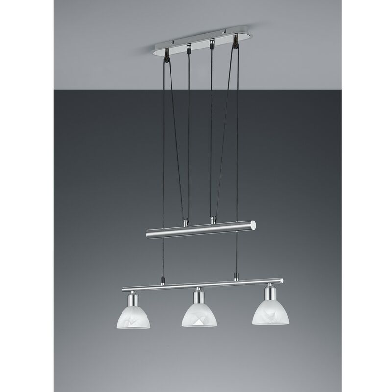 La lampada a sospensione LEVISTO di Trio Lighting presenta un profilo in metallo di colore nichel opaco e 3 paralumi in vetro color alabastro, rivolti verso il basso. Cavetti regolabili in lunghezza grazie al sistema sali e scendi e al contrappeso che facilita la regolazione dell'altezza. Dotata di 3 lampadine E14 LED da 5 watt, 400 lumen, 3000k luce calda incluse. Una volta guaste le lampadine sono facilmente sostituibili. Un elemento dal design moderno che si adatta bene a tutti gli ambienti privati residenziali o anche pubblici come locali commerciali ricettivi. Perfetta per illuminare in maniera ampiamente diffusa verso il basso, da collocare ad esempio sopra il tavolo della sala da pranzo, la penisola della cucina o anche tavoli e banconi di bar e ristoranti. Disponibile anche la versione di colore ottone satinato e altri articoli correlati della stessa serie.