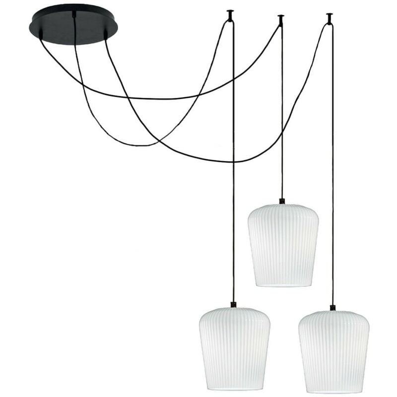 Sospensione moderna tre luci provvista di decentramenti che permettono di spostare la luce secondo le proprie necessità, sia per funzionalità o sia per un tocco ornamentale. Una lampada da sospensione ideale per ambienti moderni e per illuminare piani d'appoggio come tavoli da pranzo, penisole e scrivanie oppure da posizione al centro della stanza. Una facile installazione per una resa di luce senza limiti. Sospensione vetro bianco Gea Luce NUMA BR3 Lampada a sospensione, vetro bianco opale, 3 luci, E27 LED Base tonda 3 luci (30cmx3cm h), piattello copri base 32cm, con finitura nera, provvista di staffa per installazione al soffitto. A richiesta bianca o ottone spazzolato. Ogni singolo vetro misura 23cm (parte superiore) e 16.8cm (parte inferiore). Alluminio, plastica e filo elettrico nero . A richiesta filo elettrico bianco. Il lampadario Numa BR3 è provvisto di 3 portalampade attacco E27 per lampadine a led. La classe energetica non viene specificata perchè il suo risparmio dipende