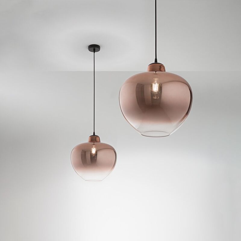 Sospensione con montatura in metallo nero opaco e vetro trasparente con sfumatura. Cavo in tessuto nero