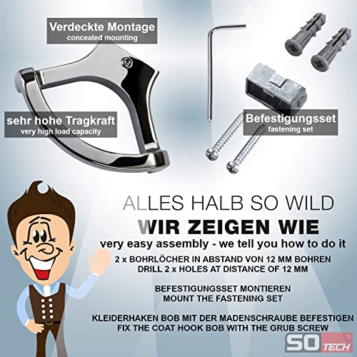 Sotech Appendiabiti BOB 72 x 52 x 38 mm finitura cromo lucido | Appendiabiti stabile in metallo | Gancio a parete con montaggio a scomparsa | Portasciugamani incluso materiale di fissaggio