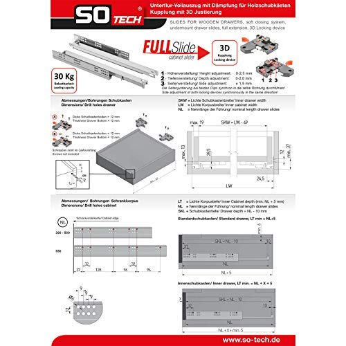 SO-TECH Guide sottopiano per cassetti UV2-30-K3D-L500-SC 30Kg FullSlide Soft-Close - con regolazione 3D