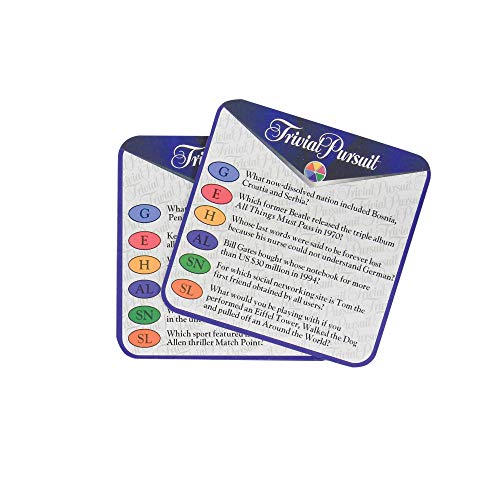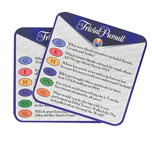 Set di 20 sottobicchieri: un set di 20 sottobicchieri per bevande, ogni sottobicchiere ha 6 domande banali di inseguimento, una di ogni classica categoria Trivial Pursuit utilizzata nel gioco senza tempo