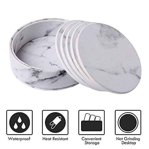 Sottobicchieri Marmo, 6 Pezzi Sottobicchiere Rotondo in Pelle di Marmo, Impermeabile, con Supporto, per la Casa, l'Ufficio e la Cucina, Sottobicchiere in Vetro per Bevande da tè e Caffè (Blanco)