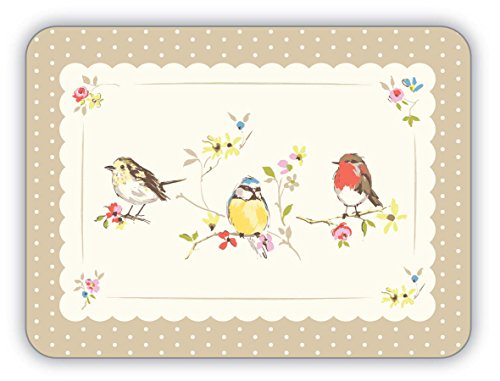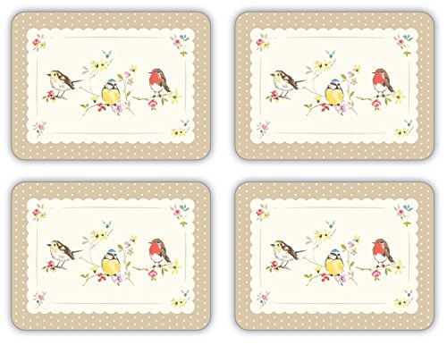 Set di 4 tovagliette ognuna con lo stesso design e 4 sottobicchieri ognuno con un diverso disegno di uccelli.